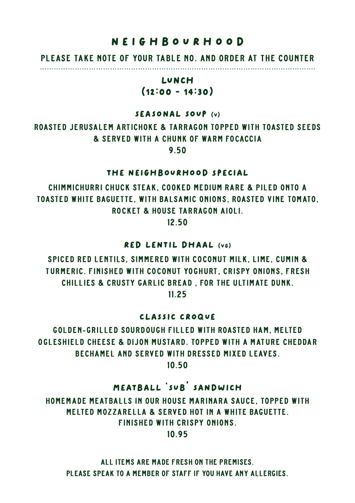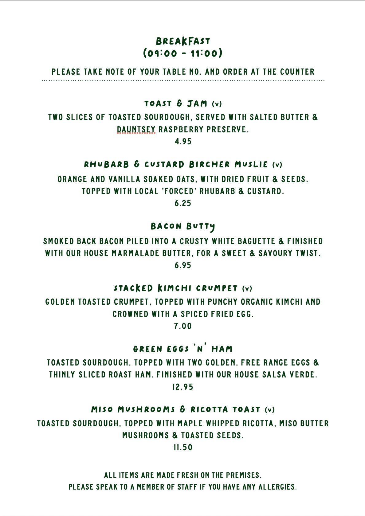 SAMPLE MENUS Our menu changes with the seasons, built around fresh ingredients WITH BIG flavours. OH AND OF COURSE GREAT COFFEE TO GO WITH IT.